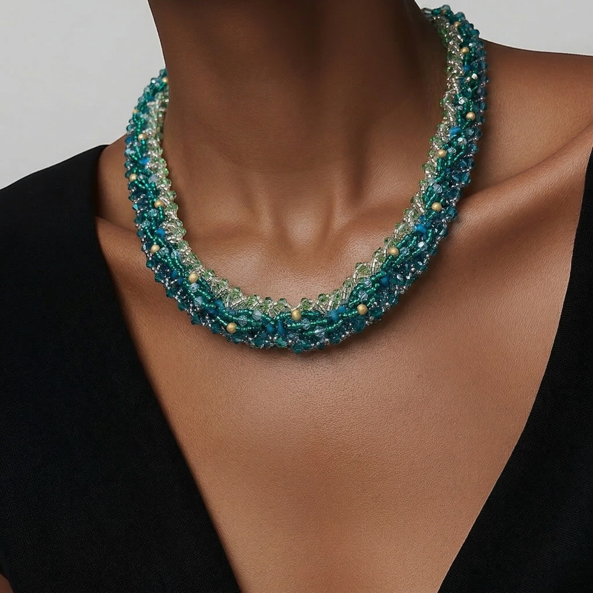 2. Materiaal: Swarovski toupies 5328 3mm, swarovski parels 5810 gold licht groen 4mm, rocailles en Delicas